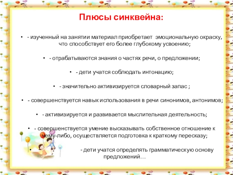 Плюсы синквейна: - изученный на занятии материал приобретает эмоциональную окраску, что способствует его более глубокому усвоению; - отрабатываются