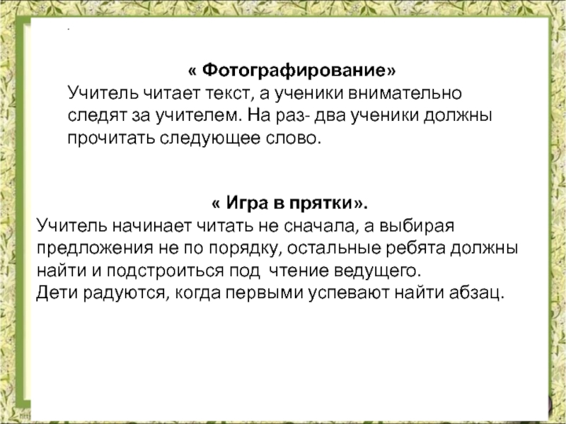 Учитель читает текст, а ученики внимательно следят за учителем. На раз- два ученики должны прочитать следующее слово.