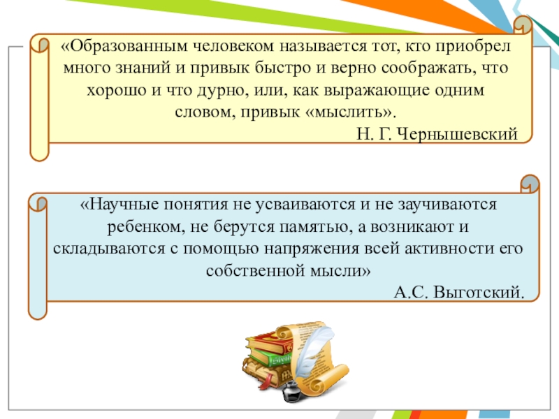 «Научные понятия не усваиваются и не заучиваются ребенком, не берутся памятью, а возникают и складываются с помощью напряжения всей активности его собственной мысли»