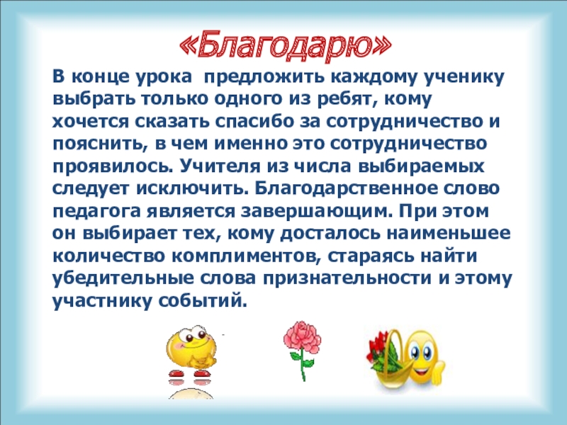кому хочется сказать спасибо за сотрудничество и пояснить, в чем именно это сотрудничество проявилось. Учителя из числа выбираемых следует исключить. Благодарственное слово педагога является завершающим. При этом он выбирает тех, кому досталось наименьшее количество комплиментов, стараясь найти убедительные слова признательности и этому участнику событий.