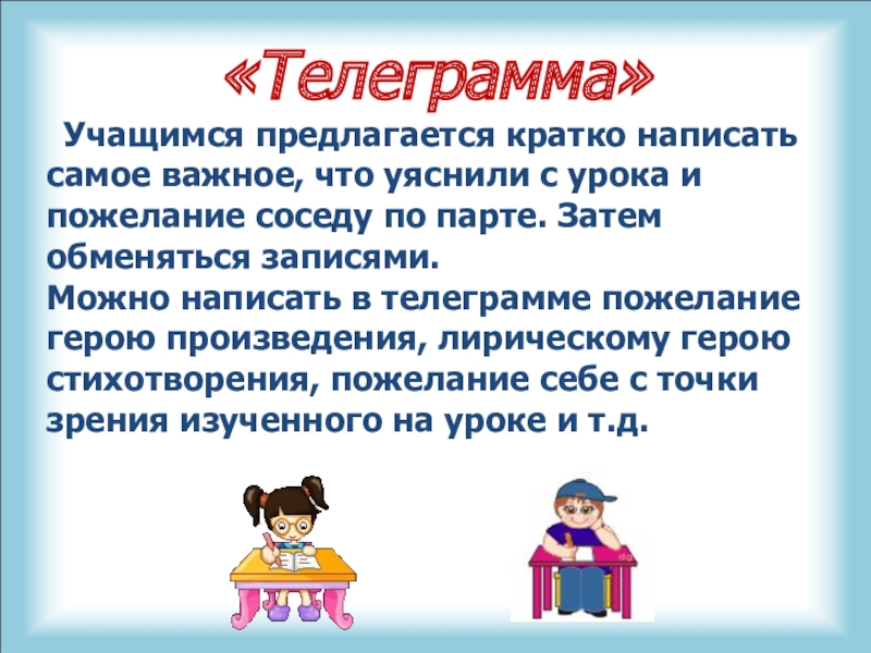 Можно написать в телеграмме пожелание герою произведения, лирическому герою стихотворения, пожелание себе с точки зрения изученного на уроке и т.д.