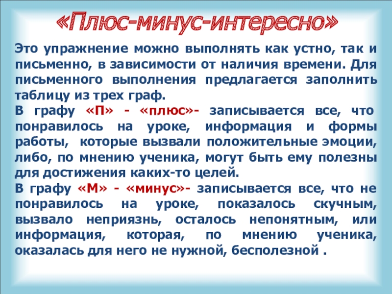 В графу «П» - «плюс»- записывается все, что понравилось на уроке, информация и формы работы, которые вызвали положительные эмоции, либо, по мнению ученика, могут быть ему полезны для достижения каких-то целей.