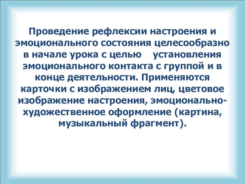 Слайд 5Проведение рефлексии настроения и эмоционального состояния целесообразно в начале урока с