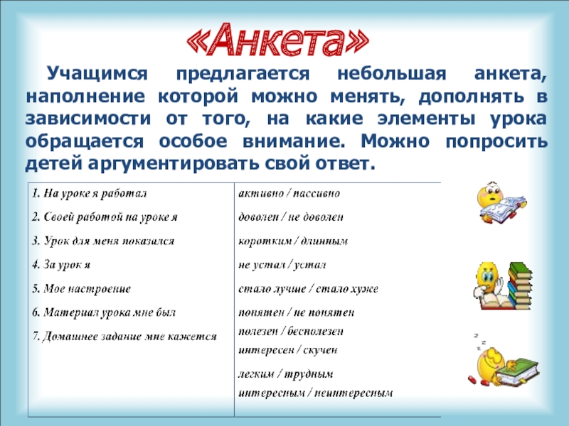Учащимся предлагается небольшая анкета, наполнение которой можно менять, дополнять