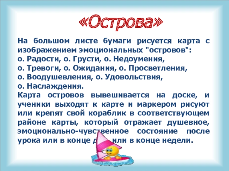 Карта островов вывешивается на доске, и ученики выходят к карте и маркером рисуют или крепят свой кораблик в соответствующем районе карты, который отражает душевное, эмоционально-чувственное состояние после урока или в конце дня, или в конце недели.