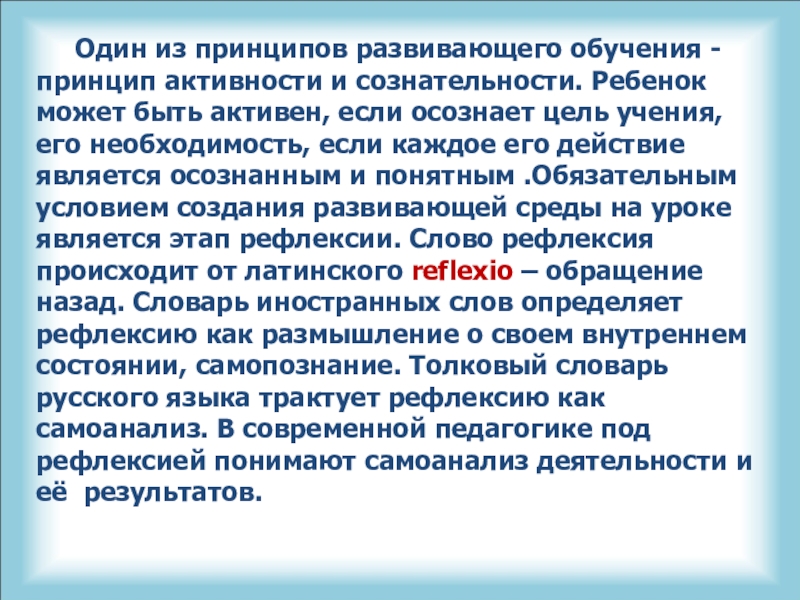 и сознательности. Ребенок может быть активен, если осознает цель учения, его необходимость, если каждое его действие является осознанным и понятным .Обязательным условием создания развивающей среды на уроке является этап рефлексии. Слово рефлексия происходит от латинского reflexio – обращение назад. Словарь иностранных слов определяет рефлексию как размышление о своем внутреннем состоянии, самопознание. Толковый словарь русского языка трактует рефлексию как самоанализ. В современной педагогике под рефлексией понимают самоанализ деятельности и её результатов.