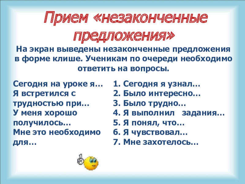 Слайд 38 Прием «незаконченные предложения»