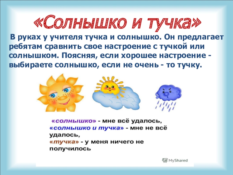 ребятам сравнить свое настроение с тучкой или солнышком. Поясняя, если хорошее настроение -выбираете солнышко, если не очень - то тучку.