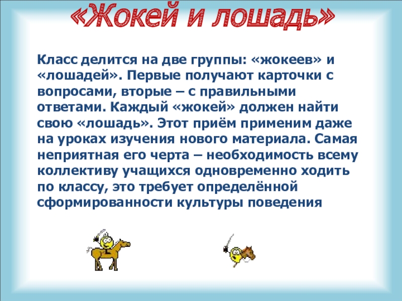 Первые получают карточки с вопросами, вторые – с правильными ответами. Каждый «жокей» должен найти свою «лошадь». Этот приём применим даже на уроках изучения нового материала. Самая неприятная его черта – необходимость всему коллективу учащихся одновременно ходить по классу, это требует определённой сформированности культуры поведения