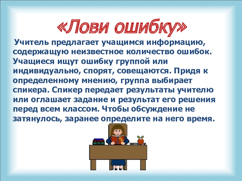 ищут ошибку группой или индивидуально, спорят, совещаются. Придя к определенному мнению, группа выбирает спикера. Спикер передает результаты учителю или оглашает задание и результат его решения перед всем классом. Чтобы обсуждение не затянулось, заранее определите на него время.