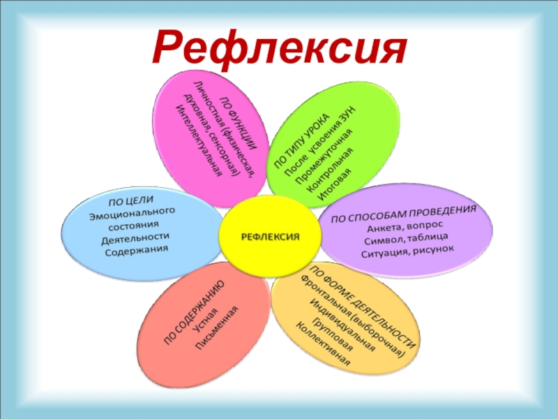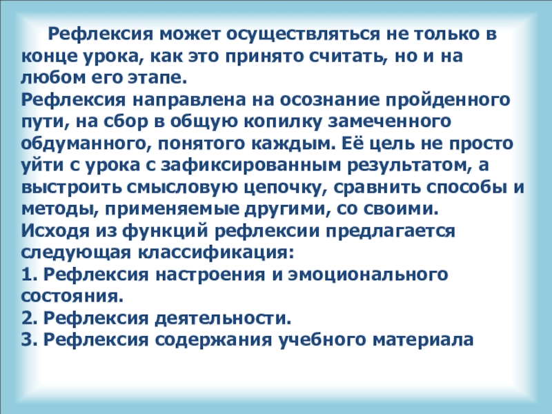 Рефлексия направлена на осознание пройденного пути, на сбор в общую копилку замеченного обдуманного, понятого каждым. Её цель не просто уйти с урока с зафиксированным результатом, а выстроить смысловую цепочку, сравнить способы и методы, применяемые другими, со своими.