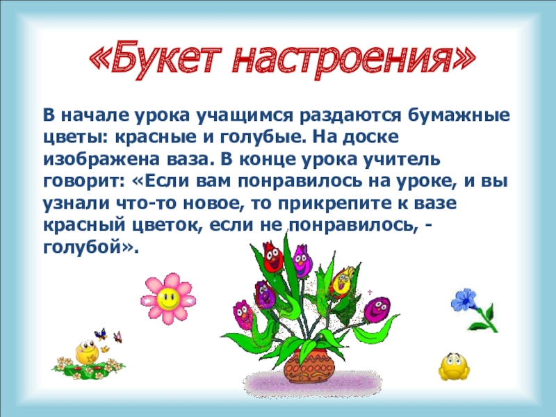 голубые. На доске изображена ваза. В конце урока учитель говорит: «Если вам понравилось на уроке, и вы узнали что-то новое, то прикрепите к вазе красный цветок, если не понравилось, - голубой».