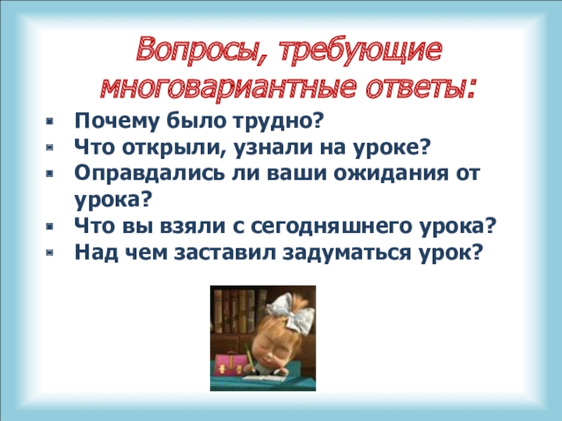 которых узнали на уроке, что бы еще хотелось узнать по данной проблеме, вопросы к учителю.