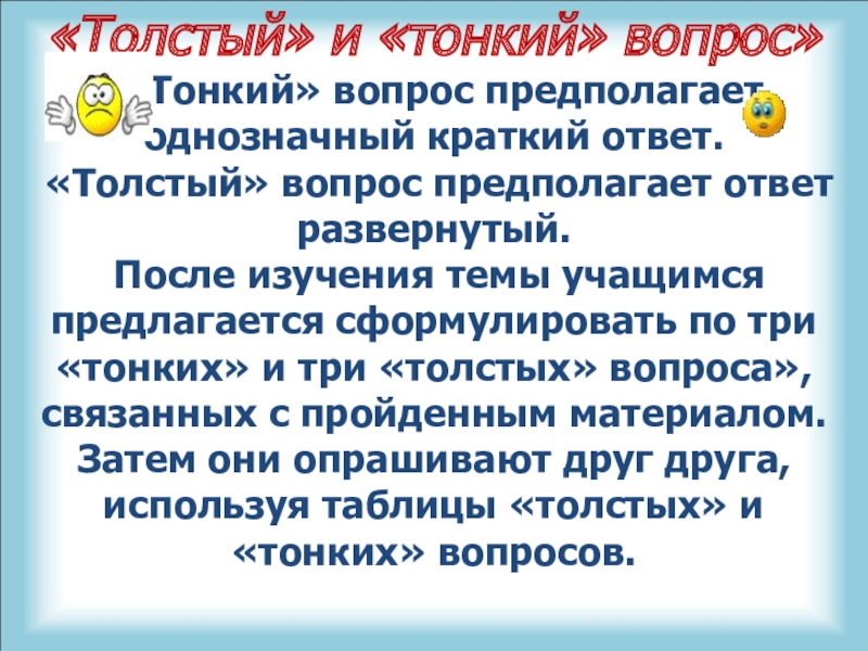 После изучения темы учащимся предлагается сформулировать по три «тонких» и три «толстых» вопроса», связанных с пройденным материалом. Затем они опрашивают друг друга, используя таблицы «толстых» и «тонких» вопросов.