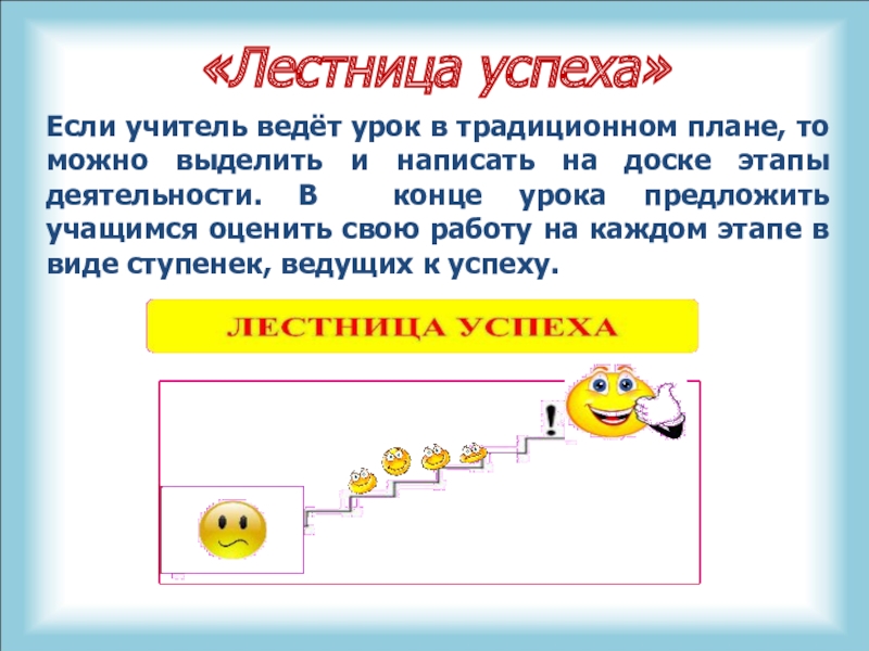 и написать на доске этапы деятельности. В конце урока предложить учащимся оценить свою работу на каждом этапе в виде ступенек, ведущих к успеху.