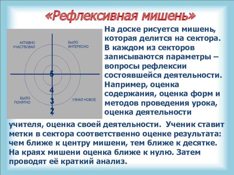учителя, оценка своей деятельности. Ученик ставит метки в сектора соответственно оценке результата: чем ближе к центру мишени, тем ближе к десятке. На краях мишени оценка ближе к нулю. Затем проводят её краткий анализ.
