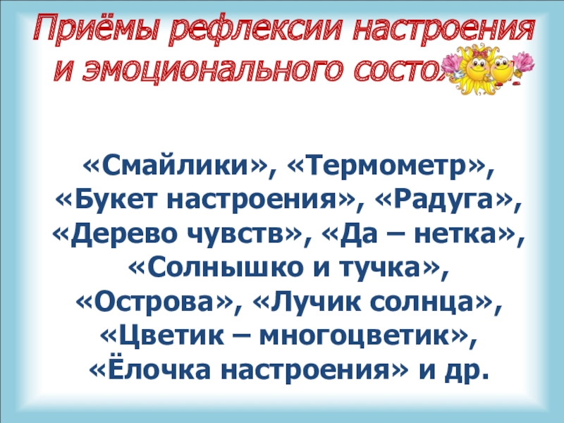 Слайд 7Приёмы рефлексии настроения