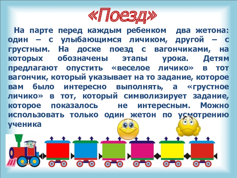 личиком, другой – с грустным. На доске поезд с вагончиками, на которых обозначены этапы урока. Детям предлагают опустить «веселое личико» в тот вагончик, который указывает на то задание, которое вам было интересно выполнять, а «грустное личико» в тот, который символизирует задание, которое показалось не интересным. Можно использовать только один жетон по усмотрению ученика