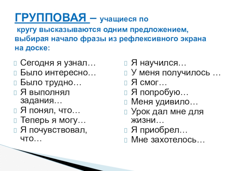 кругу высказываются одним предложением, выбирая начало фразы из рефлексивного экрана на доске: