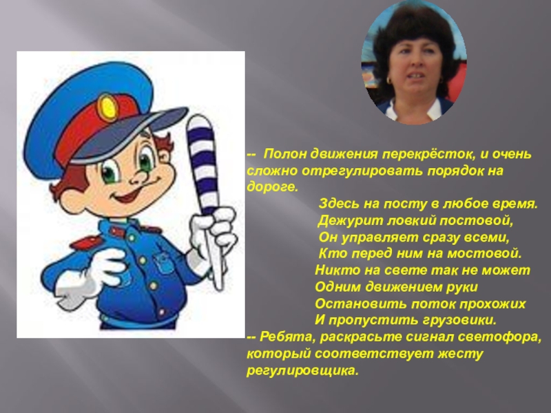 -- Ребята, раскрасьте сигнал светофора, который соответствует жесту регулировщика.