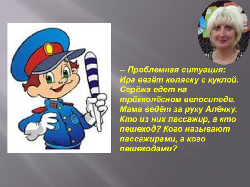 -- Проблемная ситуация: Ира везёт коляску с куклой. Серёжа едет на трёхколёсном велосипеде. Мама ведёт за руку Алёнку. Кто из них пассажир, а кто пешеход? Кого называют пассажирами, а кого пешеходами?