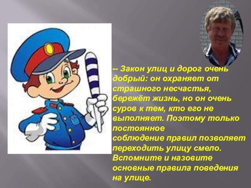 несчастья, бережёт жизнь, но он очень суров к тем, кто его не выполняет. Поэтому только постоянное соблюдение правил позволяет переходить улицу смело. Вспомните и назовите основные правила поведения на улице.