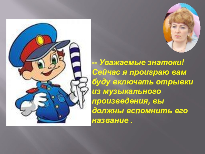 -- Уважаемые знатоки! Сейчас я проиграю вам буду включать отрывки из музыкального произведения, вы должны вспомнить его
