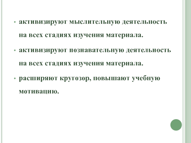 активизируют мыслительную деятельность на всех стадиях изучения материала.активизируют познавательную деятельность на всех стадиях изучения материала.расширяют кругозор, повышают