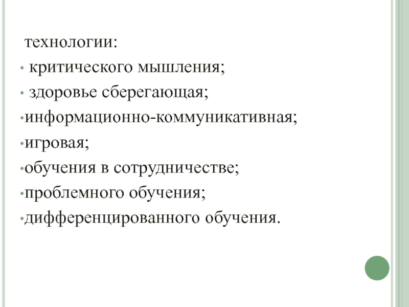 технологии: критического мышления; здоровье сберегающая;информационно-коммуникативная;игровая;обучения в сотрудничестве;проблемного обучения;дифференцированного обучения.