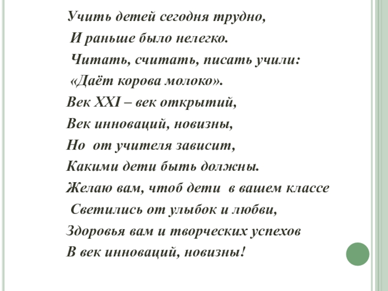 Учить детей сегодня трудно, И раньше было нелегко. Читать, считать, писать учили: «Даёт корова молоко».Век XXI – век открытий, Век инноваций,