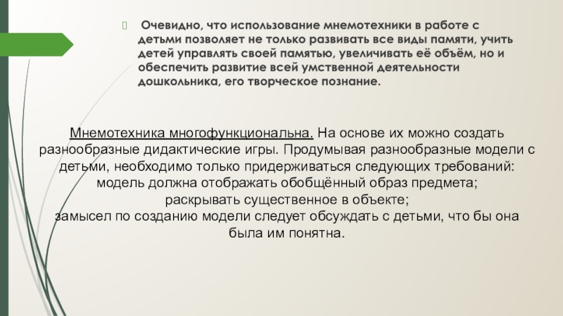 Мнемотехника многофункциональна. На основе их можно создать разнообразные дидактические игры. Продумывая разнообразные модели с детьми, необходимо только придерживаться следующих требований: