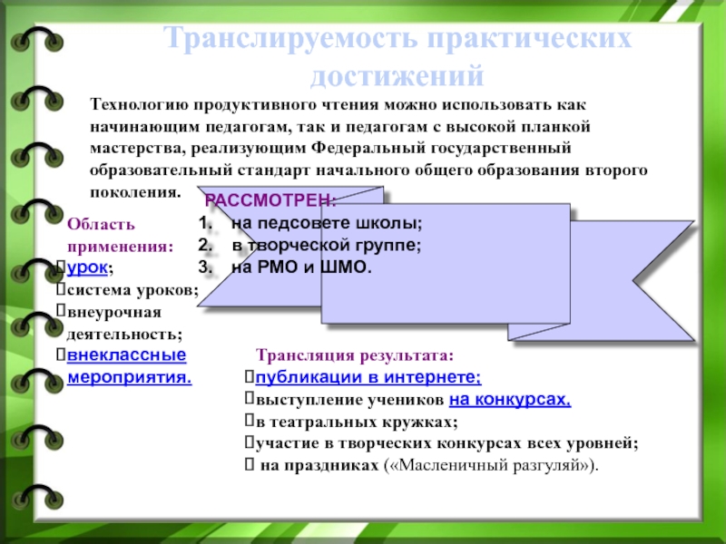 Суть данной технологии: «Стимулировать интерес учащихся к определенным проблемам, предполагающим владение определенной суммой знаний. Обучать на основе учебных ситуаций, предусматривающих решение этих проблем. Учить читать тексты с использованием трёх этапов работы с текстом. Овладевать смысловым чтением. Развивать у детей способность самостоятельного мышления в процессе обсуждения прочитанного. Совершенствовать культуру чтения, интерес и мотивацию к чтению книг».