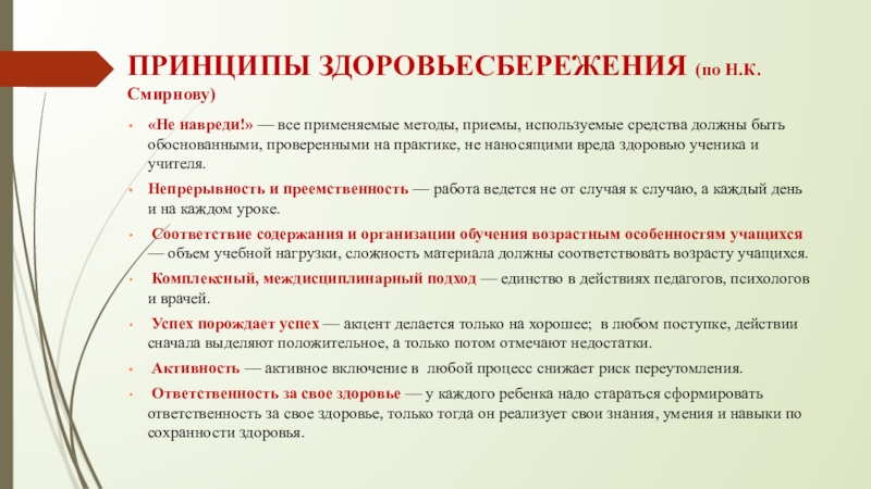 Слайд 5ПРИНЦИПЫ ЗДОРОВЬЕСБЕРЕЖЕНИЯ (по Н.К.Смирнову)