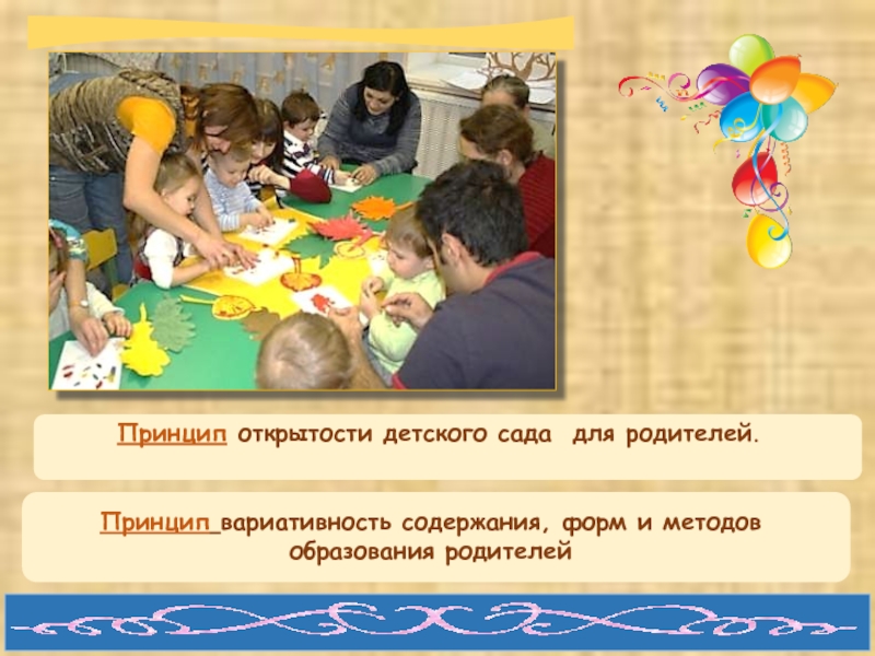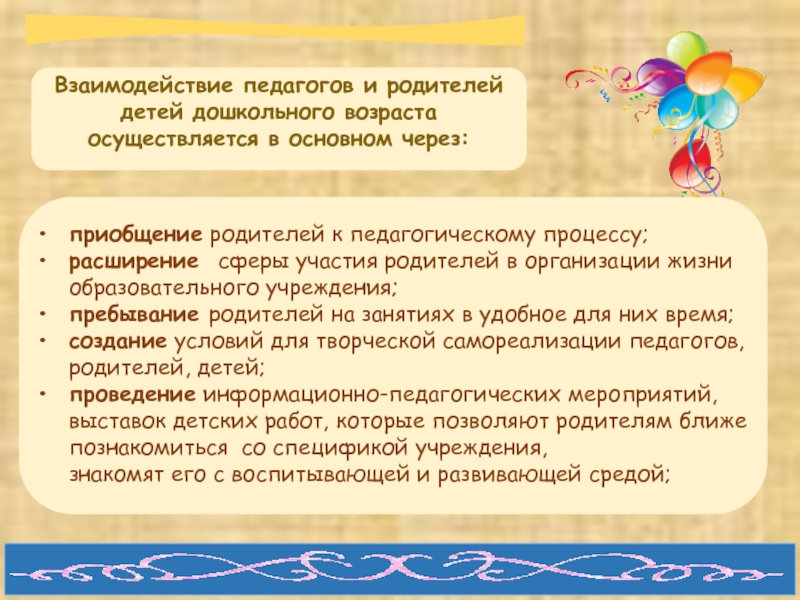 проведение информационно-педагогических мероприятий, выставок детских работ, которые позволяют родителям ближе познакомиться со спецификой учреждения, знакомят его с воспитывающей и развивающей средой;