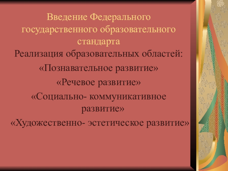 Введение Федерального государственного образовательного стандартаРеализация образовательных областей:«Познавательное развитие»«Речевое развитие»«Социально- коммуникативное развитие»«Художественно- эстетическое развитие»