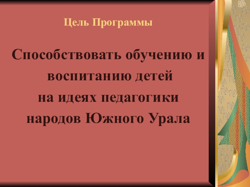 Цель ПрограммыСпособствовать обучению и воспитанию детей на идеях педагогики народов Южного Урала