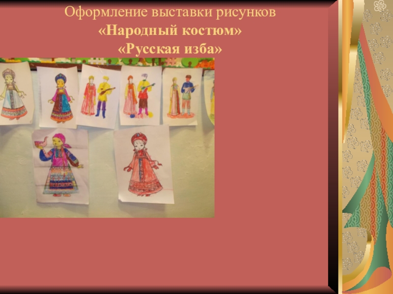 Слайд 17Оформление выставки рисунков «Народный костюм» «Русская изба»