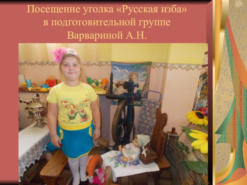 Слайд 19Посещение уголка «Русская изба» в подготовительной группе Варвариной А.Н.