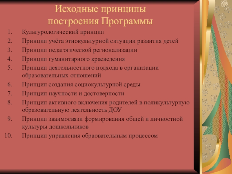 Исходные принципы  построения ПрограммыКультурологический принципПринцип учёта этнокультурной ситуации развития детейПринцип педагогической регионализацииПринцип гуманитарного краеведенияПринцип деятельностного подхода