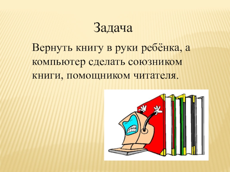 ЗадачаВернуть книгу в руки ребёнка, а компьютер сделать союзником книги, помощником читателя.