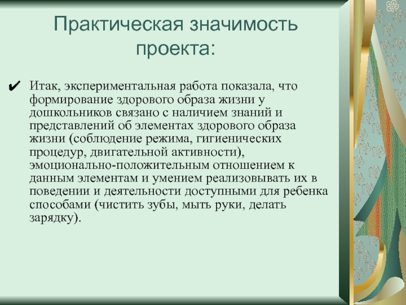 Итак, экспериментальная работа показала, что формирование здорового образа жизни у дошкольников связано с наличием знаний и представлений об элементах здорового образа жизни (соблюдение режима, гигиенических процедур, двигательной активности), эмоционально-положительным отношением к данным элементам и умением реализовывать их в поведении и деятельности доступными для ребенка способами (чистить зубы, мыть руки, делать зарядку).