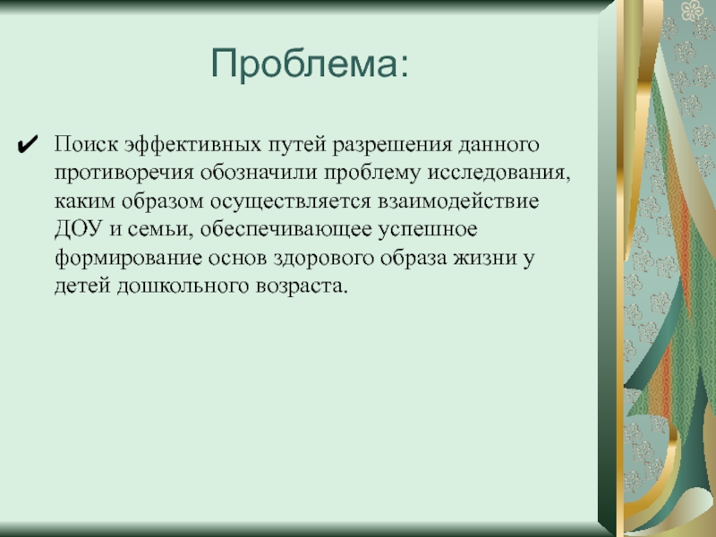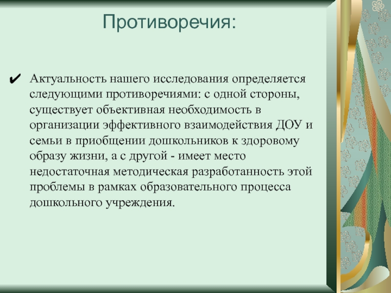 необходимость в организации эффективного взаимодействия ДОУ и семьи в приобщении дошкольников к здоровому образу жизни, а с другой - имеет место недостаточная методическая разработанность этой проблемы в рамках образовательного процесса дошкольного учреждения.