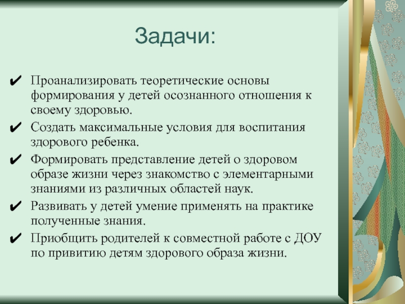 Проанализировать теоретические основы формирования у детей осознанного отношения к своему здоровью.