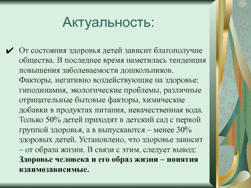 тенденция повышения заболеваемости дошкольников. Факторы, негативно воздействующие на здоровье: гиподинамия, экологические проблемы, различные отрицательные бытовые факторы, химические добавки в продуктах питания, некачественная вода. Только 50% детей приходят в детский сад с первой группой здоровья, а в выпускаются – менее 30% здоровых детей. Установлено, что здоровье зависит – от образа жизни. В связи с этим, следует вывод: Здоровье человека и его образ жизни – понятия взаимозависимые.