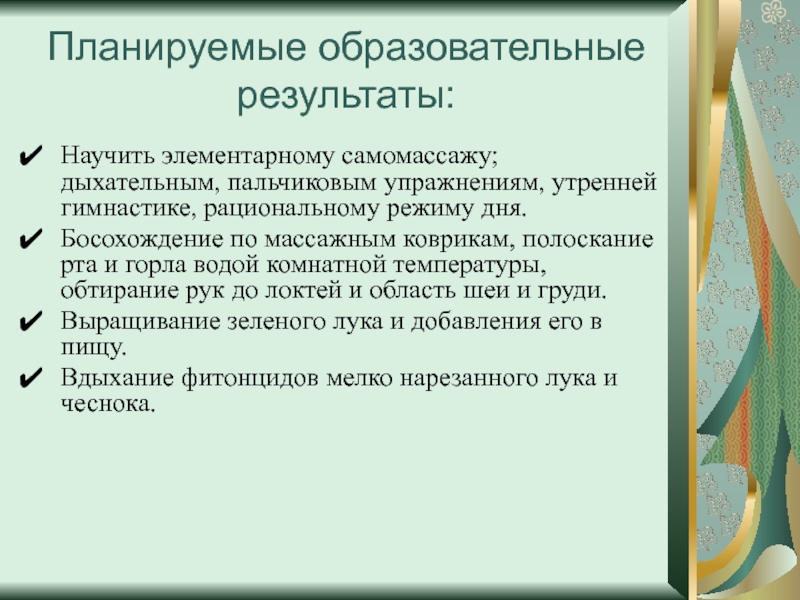 Научить элементарному самомассажу; дыхательным, пальчиковым упражнениям, утренней гимнастике, рациональному