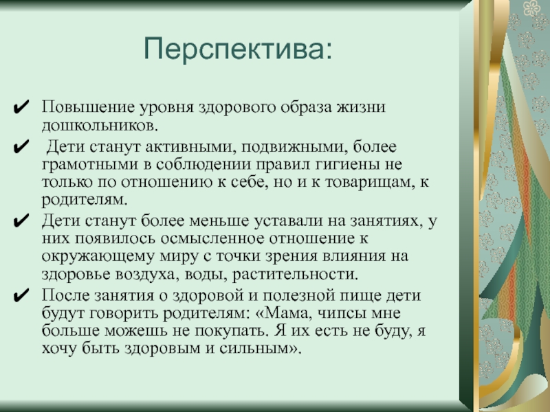 Дети станут более меньше уставали на занятиях, у них появилось осмысленное отношение к окружающему миру с точки зрения влияния на здоровье воздуха, воды, растительности.
