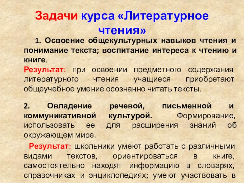 Слайд 1Приоритетные цели курса «Литературное чтение» в начальной школе (ФГОС).