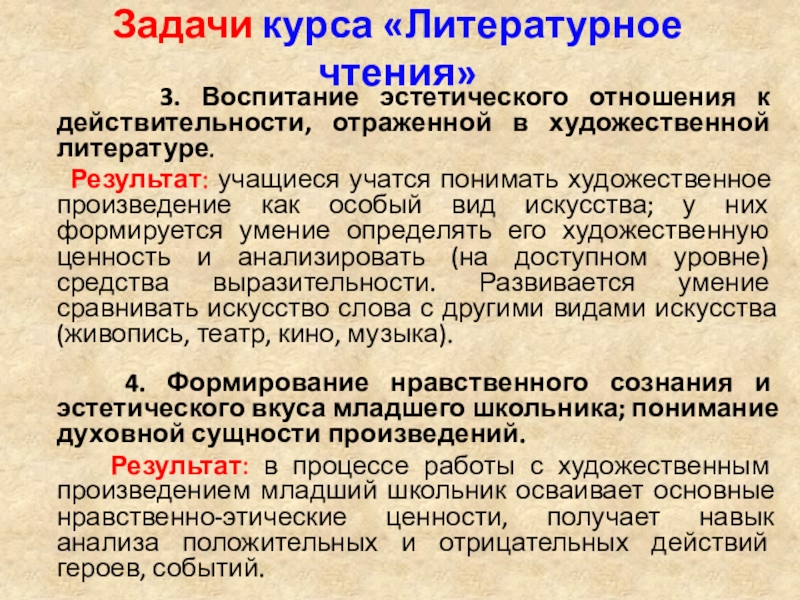 4. Формирование нравственного сознания и эстетического вкуса младшего школьника; понимание духовной сущности произведений.