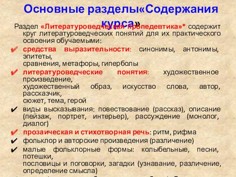 Раздел «Литературоведческая пропедевтика»* содержит круг литературоведческих понятий для их