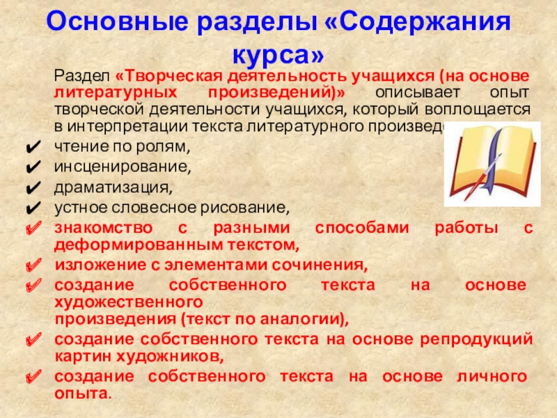 основе литературных произведений)» описывает опыт творческой деятельности учащихся, который воплощается в интерпретации текста литературного произведения: